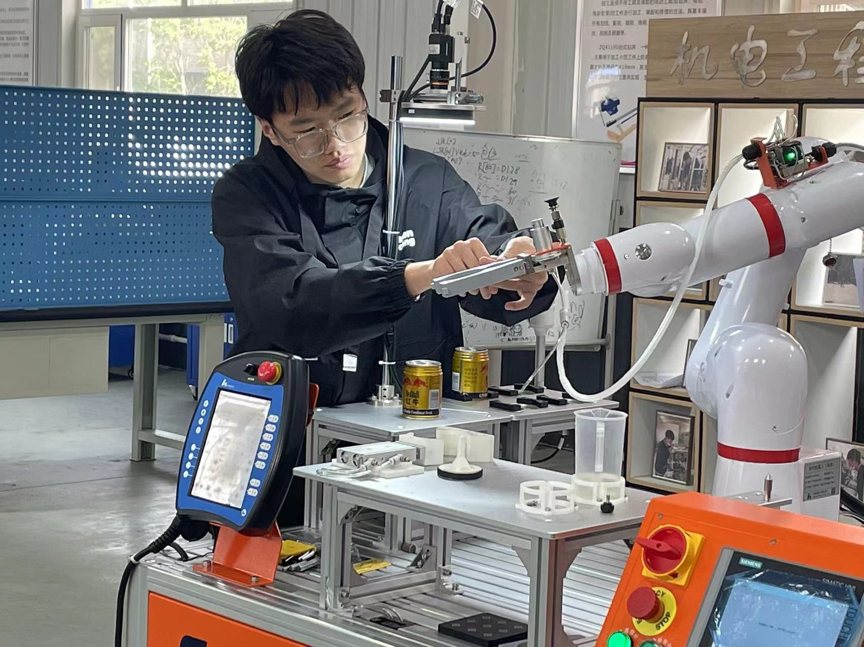 科技赋能,协作创新。5月11日,2024年第17届全国三维数字化创新设计大赛“华中数控杯”工业协作机器人及数字孪生技术创新应用专项赛校内选拔赛圆满结束。本次大赛由EMC易倍官方网站承办,武汉华中数控股份有限公司提供技术服务。共9组队伍参赛,其中5组队伍进入省赛。比赛期间,邀请武汉华中数控股份有限公司工程师王健、苗福全作为评委,各组指导教师及员工近20余人前往赛场观摩指导,确保比赛公平、公正、规范地进行。