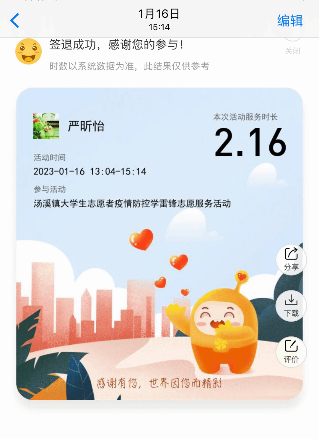 除了校内做志愿者,她在大一上半学年回到家乡浙江金华汤溪,随镇团委为后山村的留守老人送去寒假慰问礼,与村里的儿童交流玩耍,给他们买来文具零食。当然,她还在寒假期间调动空余时间给乡里大人打下手,获得乡下实践活动的证明。在浙江金华,做过垃圾分类的引导员,引导社区成员定时定点投放垃圾。