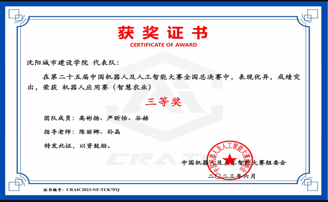 第二十五届中国机器人及人工智能全国总决赛机器人应用赛(智慧农业)团体三等奖