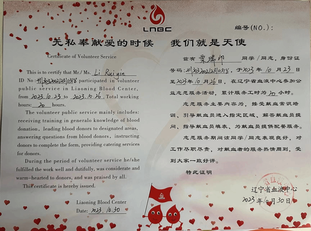 在生活上,他始终本着为同学服务的工作态度,认真负责,热心地为同学们提供各种帮助和支持。这种服务意识和责任感得到了老师和同学的好评,显示出他在人际交往和团队合作方面具备良好的能力。在2022年,他获得了优秀疫情志愿者的称号。