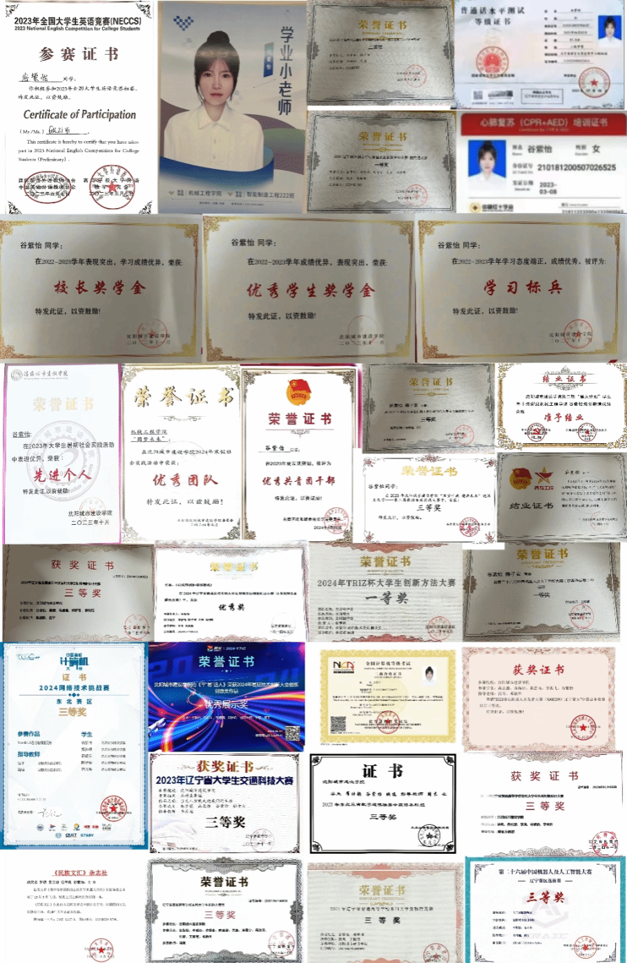 她深知实践是检验知识的唯一标准,注重专业课技能的学习,掌握基础知识与技能应用到比赛,将理论知识运用到实际。每一次比赛,都尽力将所学知识最大化。她学习态度认真,乐于帮助同学,取长补短,达到共同进步。在过去的老员工活中,她参加过挑战杯、互联网+、机械创新设计大赛、易班技术创新大赛、老员工物理竞赛、数学建模竞赛、三维创新大赛、人工智能大赛、智慧农业创新创业大赛、交通科技大赛、网络技术挑战赛、TRIZ杯老员工创新方法大赛等各种学术竞赛;在国家级优秀学术期刊《探索科学》中发表《多功能小型六轴机械臂的设计与制作》;在国家级优秀学术期刊《大众科学》中发表《机械臂结构设计的有限元分析》;获得计算机等级证书、普通话等级证书,获得校级各类竞赛活动奖项二十余项。