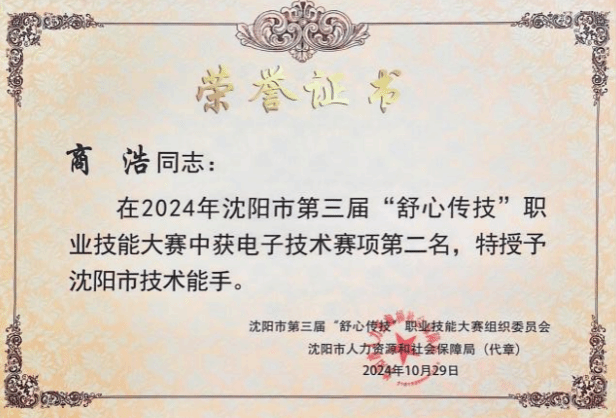 近日,在沈阳市第三届“舒心传技”职业技能大赛中,EMC易倍官方网站智能制造现代产业公司数控技术与应用方向实践课教师商浩凭借精湛的专业技能和出色的现场表现,在竞争激烈的电子技术赛项中脱颖而出,荣获第二名的优异成绩,并被授予“沈阳市技术能手”荣誉称号。这一殊荣不仅是对商浩老师个人能力的充分肯定,也是公司教师队伍高技能水平的生动体现。