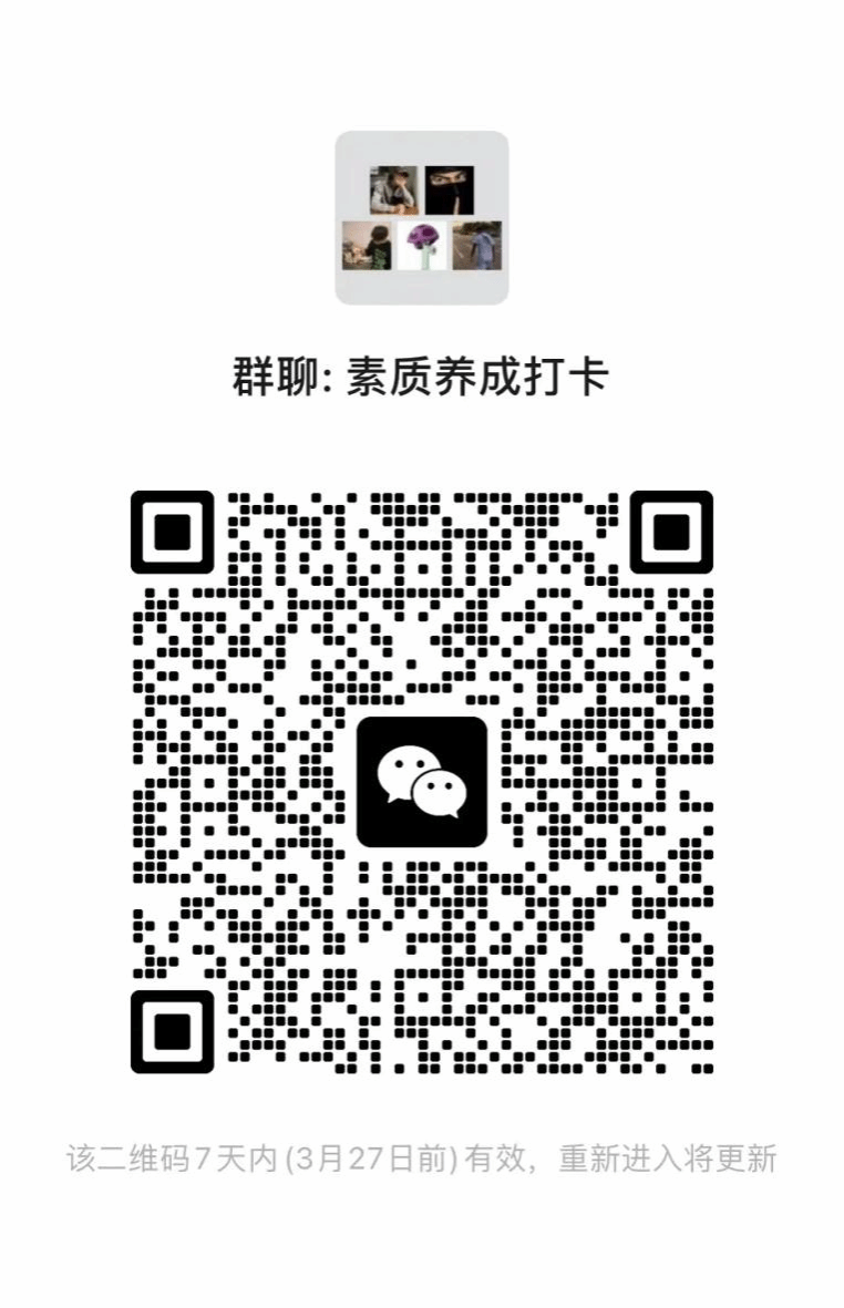 参与活动的员工加入指定微信群(群聊二维码在下方),个人利用睡前一小时时间学习公司发布的员工素质养成手册,并在小程序中进行拍照打卡,共7天(打卡二维码在下方)。